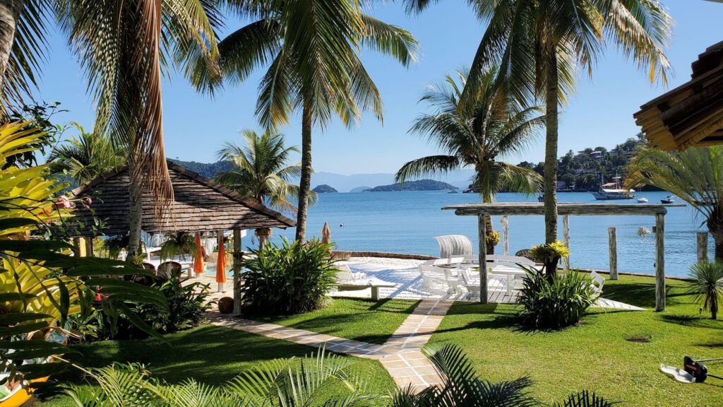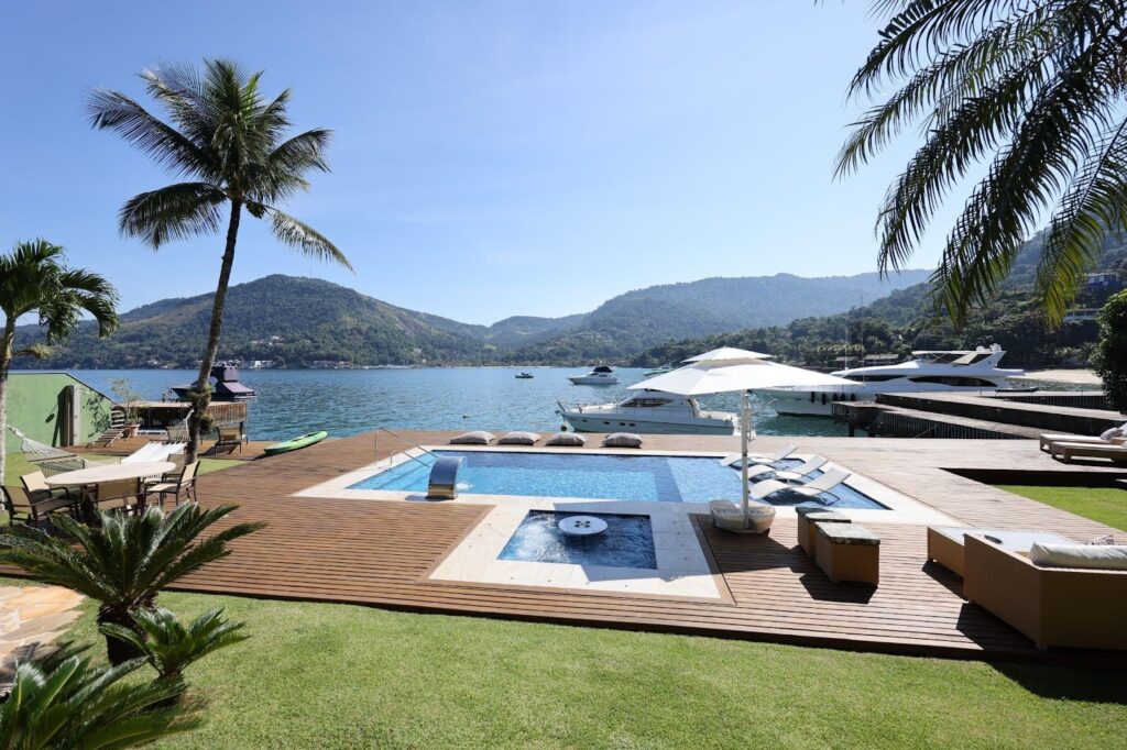 Pousada em localização privilegiada à beira mar, em frente da Ilha da Gipóia em Angra dos Reis. A propriedade tem 1567 m² de terreno e 491 m² de área construída. A área externa possui um amplo jardim com redes, áreas de lazer e refeições, piscina com pedras naturais, praia privativa artificial, guarda sol e pergolados de eucalipto tratado. Píer para lazer e atracação de embarcações, além de uma vegetação muito rica de coqueiros (que produzem frutos) e plantas típicas da região. A área interna conta com escritório, recepção, área de jogos e televisão, área de almoço e jantar com vista para o mar e dois banheiros. A cozinha é totalmente equipada com equipamentos novos tradicionais e industriais. A lavanderia possui três máquinas de lavar e de secar, além de área para passar e organizar as roupas de cama e pessoais. Uma ampla despensa para alimentos e duas adegas para aproximadamente 40 vinhos. Possui dez quartos, todos com vista ao mar, sendo oito suítes, todas recém reformadas, quarto para funcionários e quarto para crianças. Todos os quartos possuem camas queen, piso de porcelanato, armários para roupas, televisão de 50’’ou 65’’ de última geração, todos comprados e reformados em 2021. A propriedade possui ainda duas camas single extras para acomodar nos quartos. A propriedade possui gerador de 35KVA para alimentar todo o seu funcionamento, aproximadamente 16 mil litros de água (sem custo), estacionamento para 8 veículos, guincho para botes de pequeno porte, além de cinco poitas para embarcações, todas devidamente registradas na marinha.