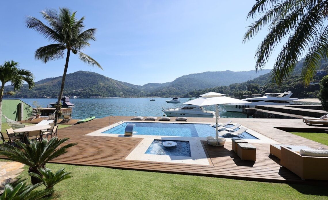 Localizada em condomínio fechado com segurança 24 horas, próximo à Ilha Grande, com travessia de apenas 15 minutos. Há também uma praia com acesso a 20 metros da casa. A propriedade possui um living para dois ambientes com vista para o mar, sala de jantar em piso elevado, lavabo, home theater, cozinha e dependência completa, um quarto e duas suítes, além de banheiro social no andar térreo. No segundo piso, há mais três suítes com varanda e vista para o mar, sendo uma delas com acesso independente. Na área externa, há um espaço gourmet com churrasqueira e forno a lenha, piscina e hidromassagem, lavabo, sauna com banheiro e ducha, além de deck para lanchas de até 60 pés. O condomínio conta com marina, heliponto e guarita com segurança.