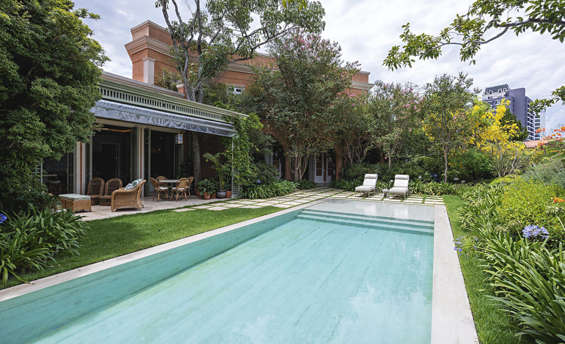 Com inspiração no estilo toscano reinterpretado de forma contemporânea, a casa foi implantada em um terreno generoso e envolvida por um jardim assinado por Alex Hanazaki, criando uma relação equilibrada entre natureza e construção.